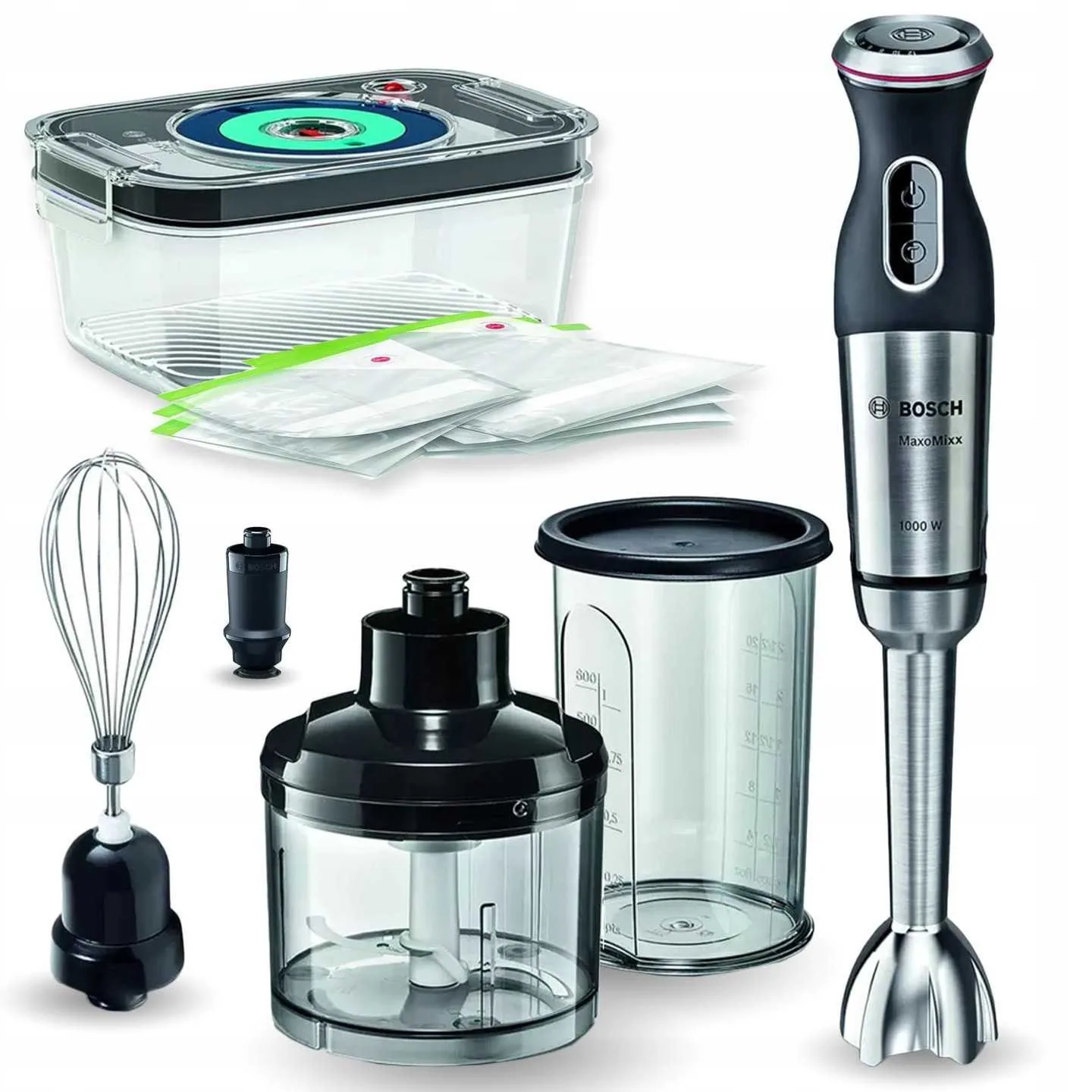 Блендер Bosch 1000вт.,реж.швидк.12,турборежим,ніжк.нерж,вінчик,стакан 600мл.,подрібнювач 500мл.,вакуумна сист.