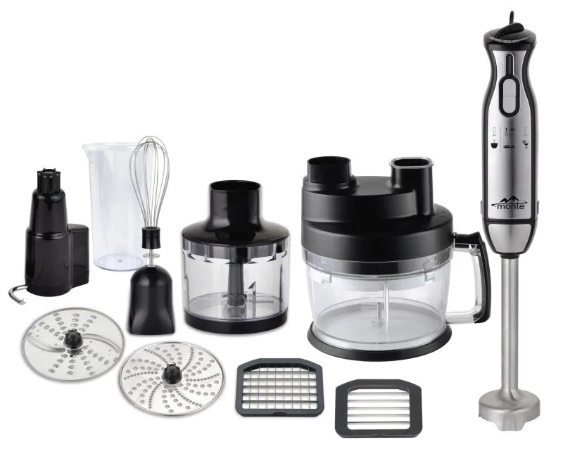 У комплекті з блендером йдуть різноманітні насадки для виконання кількох функцій: терка для дерунів, диски для нарізання, 2-сторонній диск для нарізки, насадка для кубиків і картоплі фрі. Чаша об'ємом 2 л і подрібнювач на 0,4 л дозволяють зручно працювати з великими та малими порціями. Мірний стакан об'ємом 0,6 л дає можливість точно відміряти необхідні інгредієнти для приготування страв.