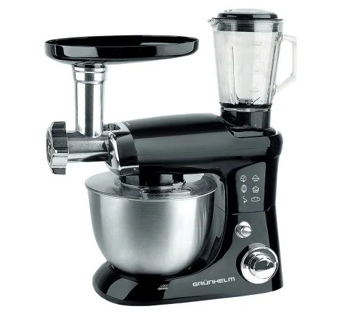 Кухонний комбайн GKM0016B Grunhelm - стане незамінним помічником на Вашій кухні. Модель обладнана планетарним міксером, м'ясорубкою і скляним блендером. Машина оснащена функціями замісу тіста, подрібнення, збивання, перемішування, подрібнення, приготування напоїв і фаршу. Знімна чаша об'ємом 4 л виготовлена з нержавіючої сталі. Для зручного використання передбачено 6 швидкостей, які регулюються за допомогою ручки.