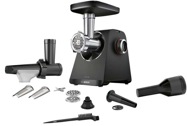 У комплект входить велика кількість насадок: для ковбасок, кеббе, соковижималка, насадка для томатів і ягід, а також двосторонній ніж і штовхач. Bosch також надає до 10 років гарантії на мотор (при реєстрації на сайті виробника), що підкреслює надійність техніки.