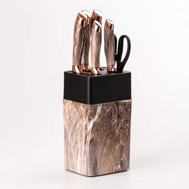 | Комплектація набору | Шеф-ніж, ніж для м'яса, ніж для хліба, універсальний ніж, ніж для фруктів, кухонні ножиці, підставка з точилом |