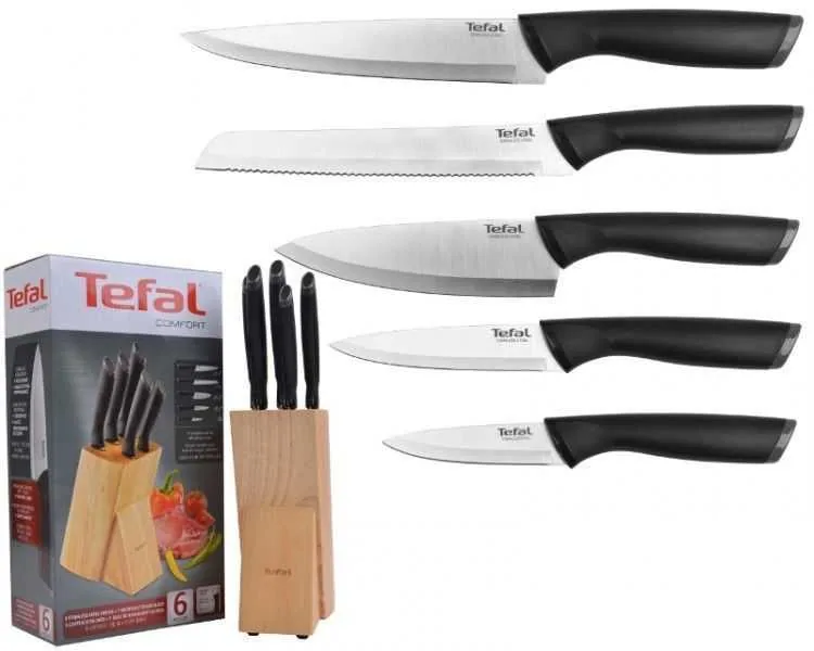 Дерев'яна підставка не лише є елегантним елементом кухонного інтер'єру, але й дозволяє зберігати ножі в порядку, захищаючи їх від пошкоджень. Набір ножів Tefal Comfort стане чудовим подарунком для тих, хто цінує якість і стиль на кухні.