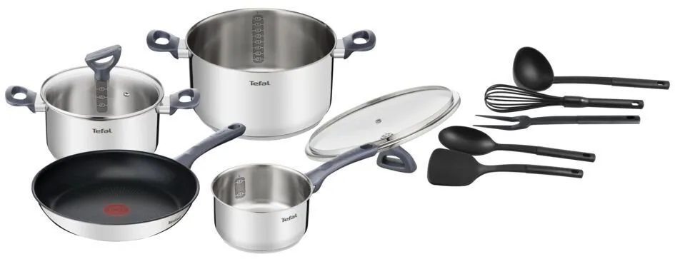 | Комплектація | Каструля з кришкою 24 см (5 л) (корисний об'єм 4 л) Каструля з кришкою 20 см (2.9 л) (корисний об'єм 2 л) Ківш 16 см без кришки (1.5 л) (корисний об'єм 1 л) Сковорода 28 см 5 аксесуарів (вилка, віночок, ополоник, лопатка, ложка) |