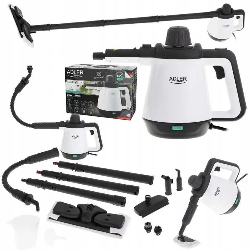 • підходить для очищення: - плитки на підлозі та стінах - вікон - текстильних та пластикових меблів - матраців • максимальна потужність: 2000 Вт • номінальна потужність: 1200 Вт • ємність бака: 450 мл • пар до: 44 г/хв • температура пари до 120 С • максимальний робочий тиск: 3,5 бар • матеріал пристрою: пластик • 13 вкладень: металева щітка, нейлонова щітка, гнучкий подовжувач шланга, подовжувальна трубка 33 см, велика насадка, плоска кисть, щітка для підлоги, роз'єм для щітки для підлоги, маленька тканина, серветка для чищення підлоги • мірний стакан • захист від перегріву • кабель живлення: 2,78 м • габарити: 31x14,5x22,2 см • колір: чорний, білий