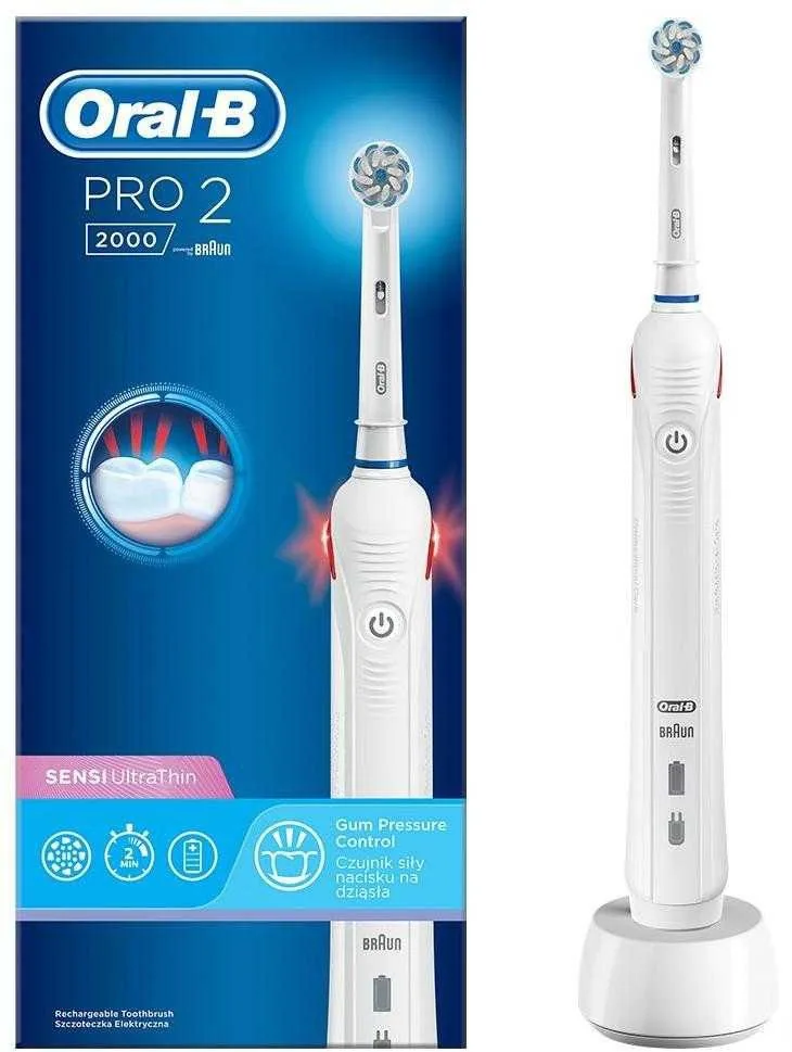 Зубна щітка Braun Oral-B Pro2 2000 Sensi Ultrathin D501.513.2 WH 3D-технологія чищення зубів (здійснює поступально-зворотні і пульсуючі рухи, видаляючи наліт з усіх боків кожного зуба і масажує ясна, зміцнюючи їх). Режими чищення: 1 (щоденний). Професійний 2-хвилинний таймер (4 по 30 секунд). Кількість насадок: 1 («Cross Action» EB 50 - для щоденного чищення зубів). Індикація низького рівня заряду. Індикація зарядки акумулятора. Датчик надмірного тиску (при сильному натисканні на щітку пульсуючі рухи автоматично відключаються і подається світлова індикація). Вологостійкий корпус. Прогумована ручка. Безконтактна зарядка. Система живлення: акумулятор.Сумісна з усіма насадками для зубних щіток Oral-B серії «EB» та «OD».