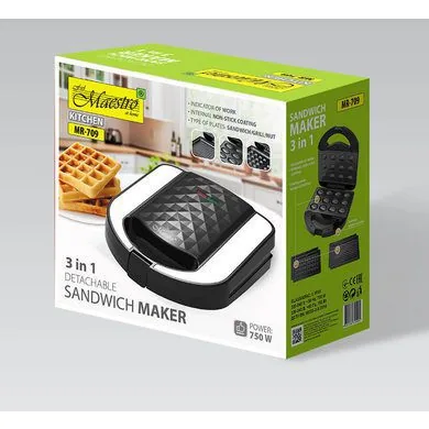 Сендвічниця Maestro 3 в 1 MR-709 — це універсальний кухонний прилад, який поєднує три функції в одному пристрої. Потужність 750 Вт дозволяє швидко готувати смачні сендвічі, вафлі та горішки, що робить її незамінним помічником на будь-якій кухні.