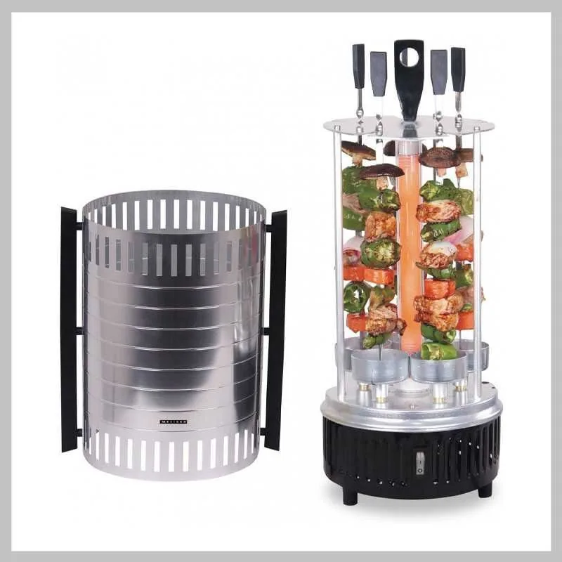 | Особливості | Регульований термостат, антипригарне покриття, вбудовані піддони для жиру, можливість приготування до 6 шампурів, легке очищення |
