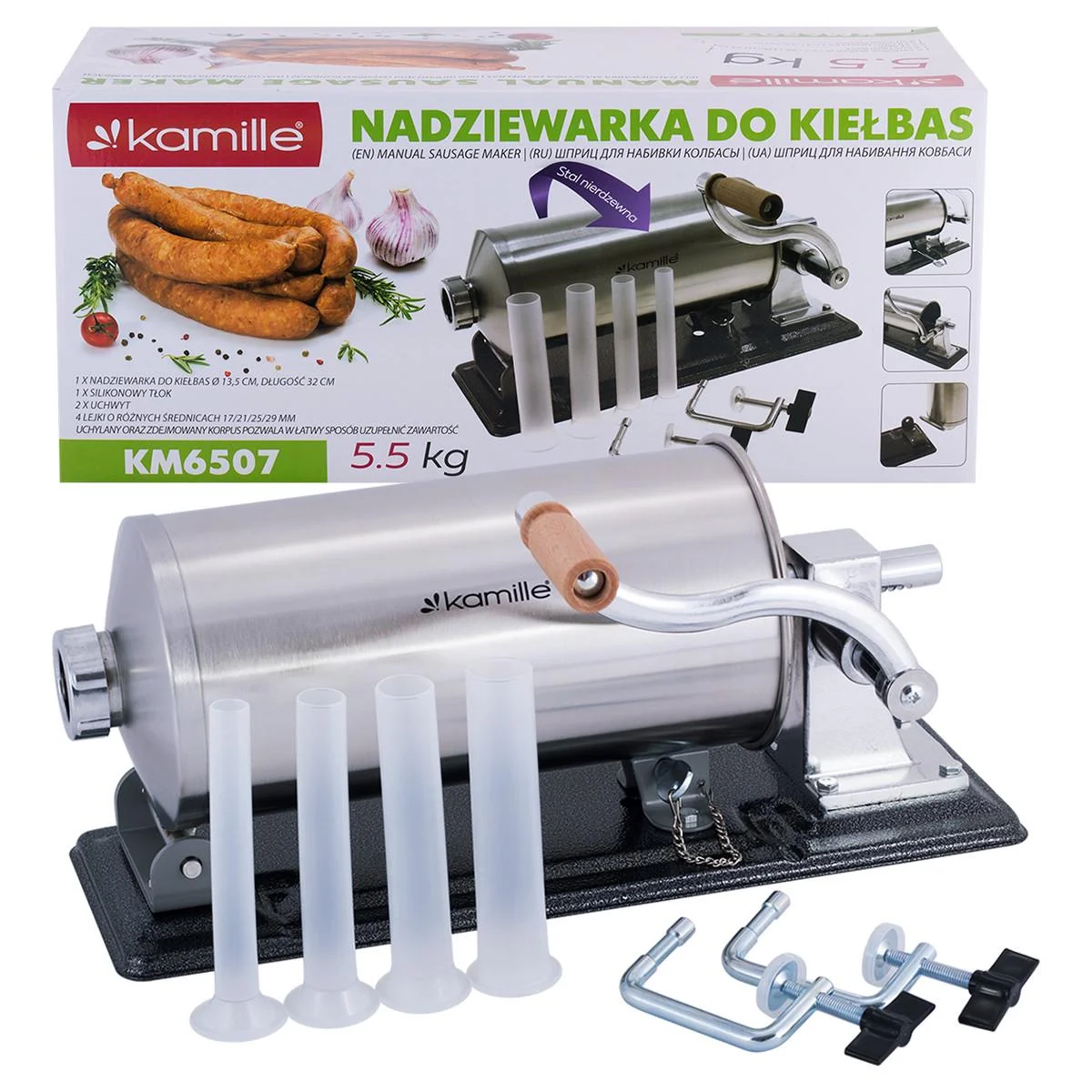 Шприц ковбасний Kamille 5.5 кг горизонтальний KM-6507 є надійним інструментом для виготовлення домашніх ковбас. Виконаний з високоякісної нержавіючої сталі, цей шприц має довговічність і стійкість до корозії. В комплекті 4 насадки діаметром Ø1,5 см, Ø2 см, Ø2,2 см, Ø2,5 см, що дозволяють регулювати товщину ковбас.