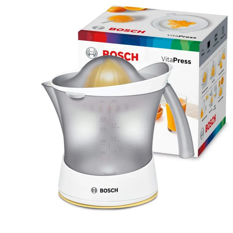Вдала модель соковитискача для цитрусових дозволить Вам швидко і легко зробити сік-фреш з плодів будь-якого розміру. Bosch MCP3500 має добре продуману і якісно виконану конструкцію з електронним управлінням, потужністю в 25 Вт. У ньому передбачено наявність контейнера для соку, об'ємом 0,8 л, з нанесеною градацією, що дозволяє вимірювати його об'єм без необхідності використання додаткових предметів. Не менш стане в нагоді і передбачена функція реверс, а також фільтр, що дозволяє регулювати кількість м'якоті. Крім цього, дана модель порадує своїм довгим терміном служби, безвідмовною роботою і низьким рівнем шуму. Автоматичне включення/виключення приладу, яке відбувається за рахунок натискання на корпус, значно спростить роботу з Bosch MCP3500, зробивши її максимально комфортною для користувача.