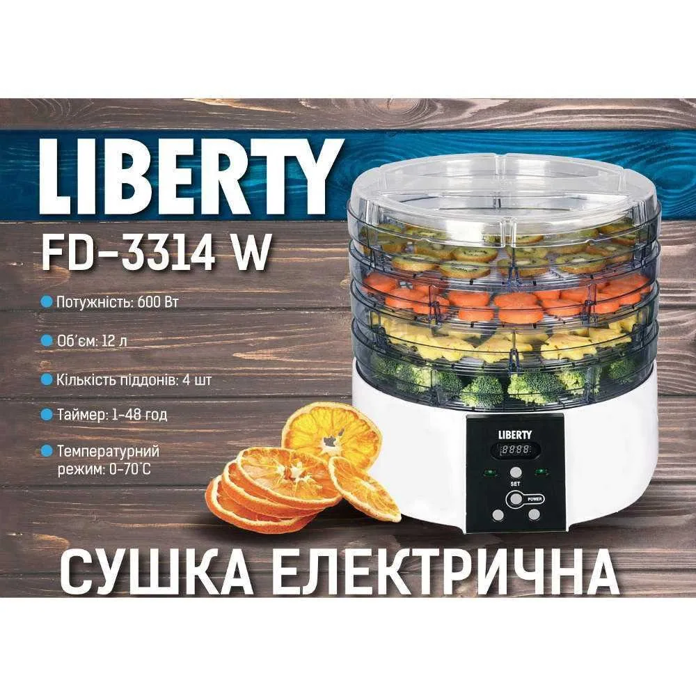 Сушка для овочів та фруктів Liberty 600вт.,4 секцій,таймер,захист від перегріва,автовикл. FD-3314W