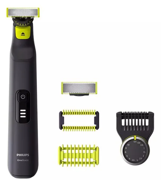 | Додаткові характеристики | Водонепроникність: вологе та сухе використання, унікальна технологія OneBlade, знімна захисна сітка для чутливих ділянок, двостороннє лезо для створення чітких контурів і рівних ліній, знімний гребінець для тіла (3 мм), інноваційне лезо рухається на 360° |